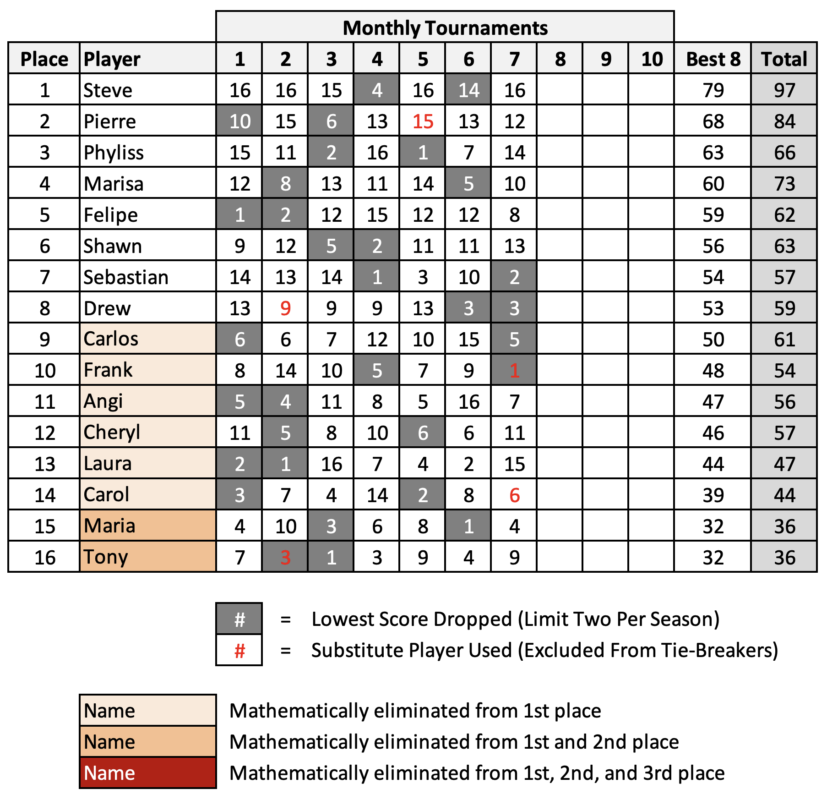First place finisher for any given tournament earns 16 points. Second place gets 15 points, third gets 14 points, and so on. No-shows count as 0 points. Each player will count their best 8 out of 10 tournament point scores toward the season total. Cells in gray do not count toward the season.